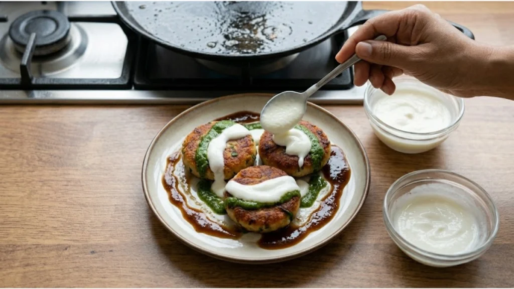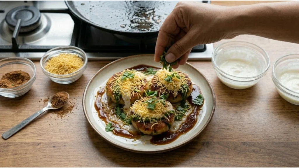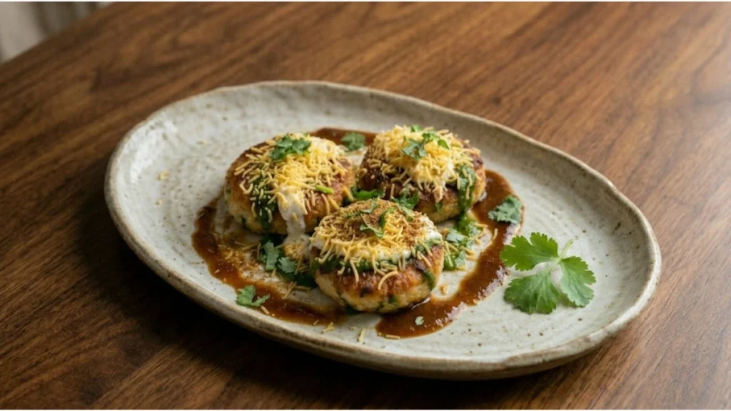 એક પ્લેટમાં તૈયાર ટિક્કી મૂકો. ઉપરથી દહીં, લીલી ચટણી અને ખજૂર-ઈમલી ચટણી ઉમેરો.