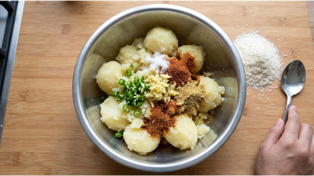 ઉકાળેલા બટાકાને મસળી લો અને તેમાં બ્રેડક્રમ્સ, લીલા મરચા, આદુ, મીઠું, લાલ મરચું અને ધાણા જીરું પાવડર ઉમેરો. હવે બધું સારી રીતે મિક્સ કરો જેથી મિશ્રણ સરખું બને.