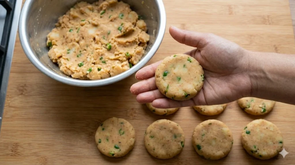 હવે નાના ગોળા બનાવીને તેને ચપટા આકારમાં દબાવો જેથી ટિક્કી તૈયાર થાય.