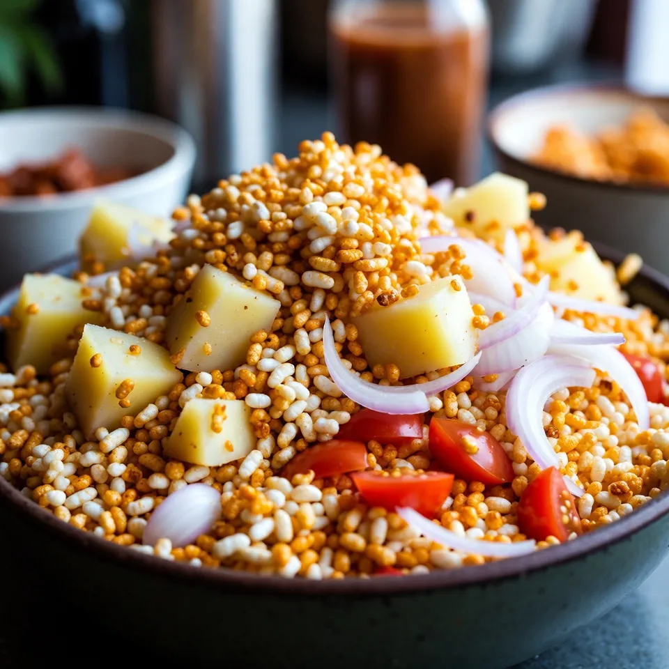 એક મોટા બાઉલમાં મમરા લો. તેમાં ઉકાળેલા બટાકા, ડુંગળી અને ટામેટાં ઉમેરો. હવે હળવે હાથે મિક્સ કરો જેથી મમરા તૂટે નહીં અને ભેળનો ક્રંચ યથાવત રહે. આ સ્ટેપમાં તમે શીંગ પણ ઉમેરશો તો સ્વાદ વધુ મસ્ત બનશે.