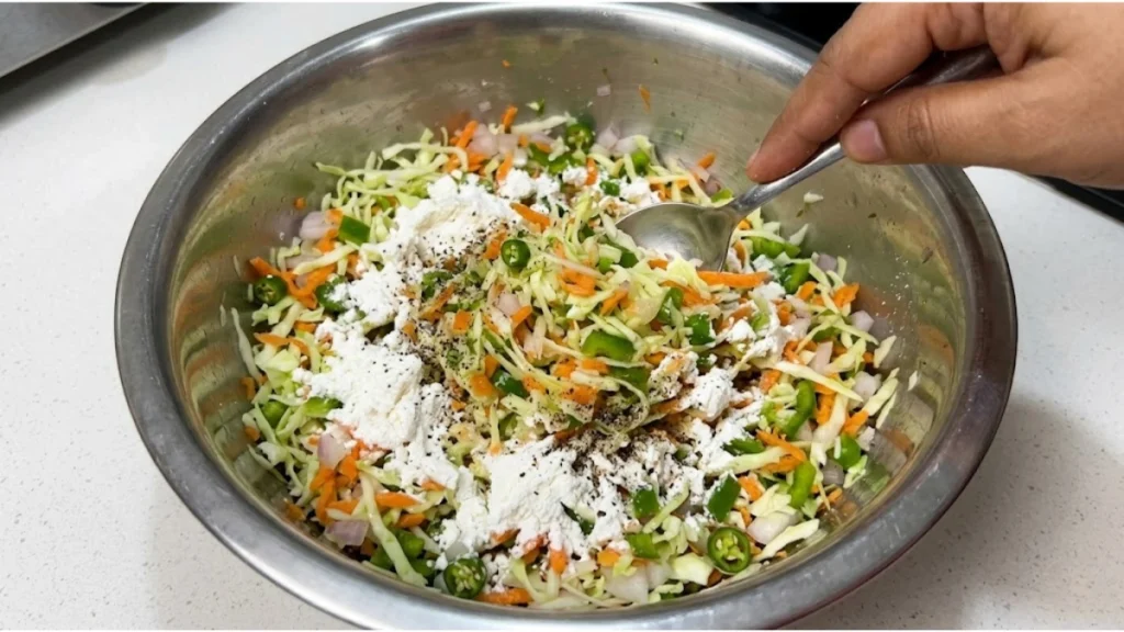 સૌ પ્રથમ એક મોટા બાઉલમાં ખમણેલી કોબી, ગાજર, સમારેલું શિમલા મરચું, ડુંગળી અને લીલા મરચા ઉમેરો. હવે તેમાં મેદો, કોર્નફ્લોર, મીઠું અને કાળી મરી ઉમેરો. શાકભાજીમાંથી થોડું પાણી છૂટે છે એટલે સામાન્ય રીતે અલગ પાણી ઉમેરવાની જરૂર ઓછી પડે છે. બધું સારી રીતે મિક્સ કરીને એકસરખું મિશ્રણ તૈયાર કરો જેથી ગોળા સરળતાથી બની શકે. જો મિશ્રણ ઢીલું લાગે તો થોડું વધુ કોર્નફ્લોર ઉમેરો.