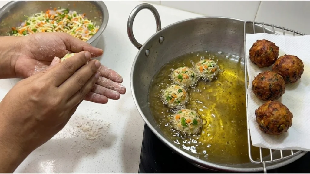 હવે તૈયાર મિશ્રણમાંથી નાના ગોળા બનાવો. દરેક ગોળો સમાન સાઈઝનો રાખશો તો તળતી વખતે સરખી રીતે શેકાશે. કડાઈમાં તેલ ગરમ કરો અને મધ્યમ આંચ પર ગોળાઓ તળો. વધુ તેજ આંચ પર તળશો તો બહારથી બ્રાઉન થઈ જશે પરંતુ અંદર કાચા રહી શકે છે. ગોલ્ડન બ્રાઉન થાય એટલે બહાર કાઢીને બાજુમાં રાખો.