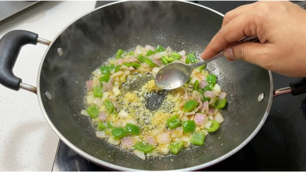 એક અલગ કડાઈમાં થોડું તેલ લો અને તેમાં આદુ-લસણ પેસ્ટ ઉમેરો. તેની સુગંધ આવે પછી સમારેલી ડુંગળી અને થોડું શિમલા મરચું ઉમેરો. શાકભાજી વધારે નરમ ન થાય તે માટે માત્ર બે મિનિટ સાંતળો જેથી તેમાં હળવો ક્રંચ રહે અને સોસમાં સરસ ટેક્સચર મળે.