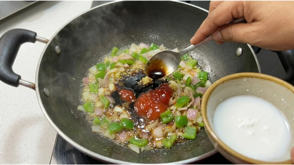 હવે તેમાં સોયા સોસ, ચિલી સોસ અને ટમેટા સોસ ઉમેરો. જરૂર મુજબ થોડું પાણી ઉમેરો અને અલગ વાટકીમાં કોર્નફ્લોર પાણીમાં ભેળવીને ઉમેરો જેથી સોસ ઘાટો બને. ધીમે હલાવતા રહો જેથી ગાંઠો ન પડે. સોસ ધીમે ધીમે ચમકદાર અને ઘાટો બનશે.