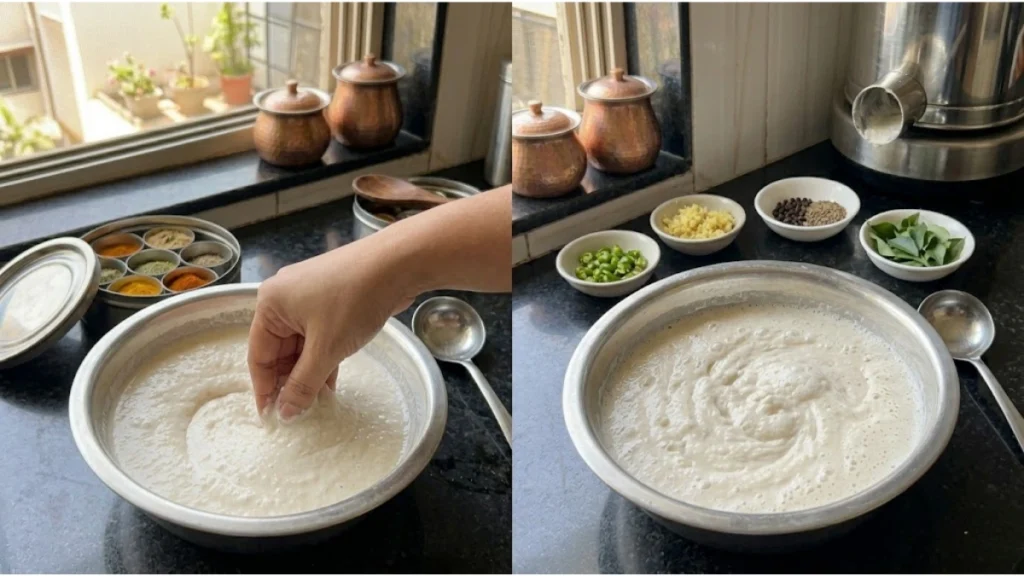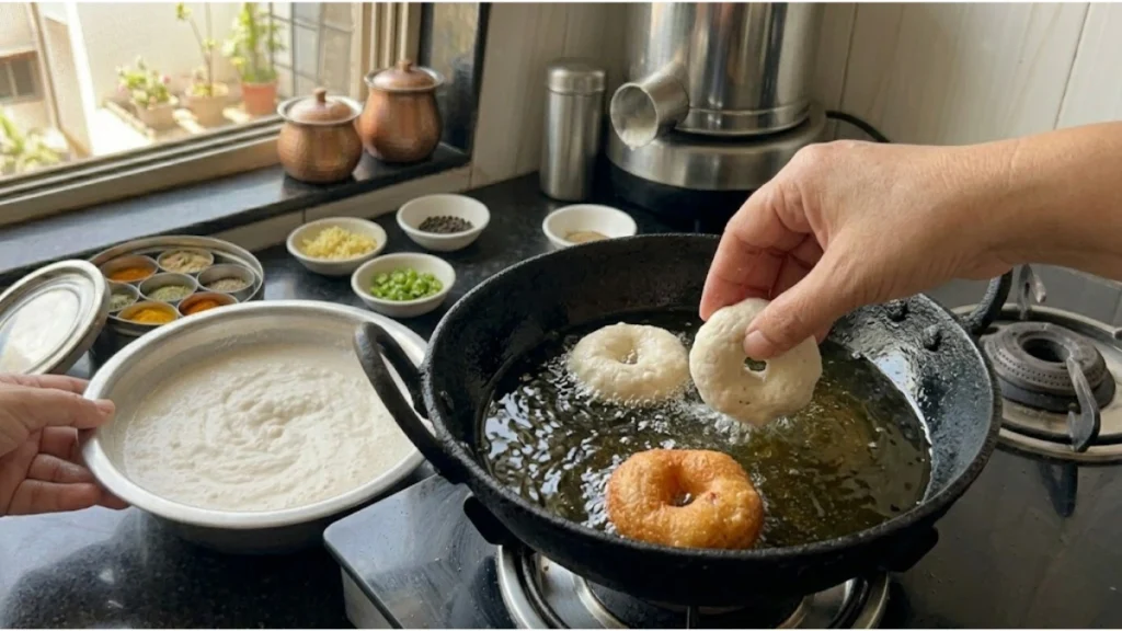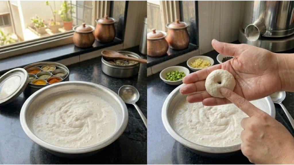 હાથને પાણીથી ભીનો કરો. હવે થોડું બેટર લઈને ગોળ આકાર આપો અને વચ્ચે નાનું છિદ્ર કરો. આ સ્ટેપ શરૂઆતમાં થોડો પ્રેક્ટિસ માંગે છે, પરંતુ ભીના હાથથી સરળ બને છે.