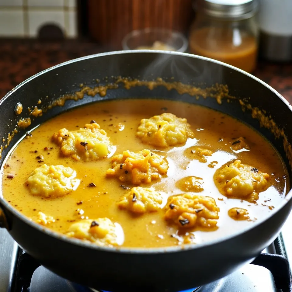 હવે દહીં-બેસન મિશ્રણ પેનમાં ઉમેરી હળવે હલાવો. મધ્યમ આંચ પર ૫–૭ મિનિટ ઉકાળો જેથી મસાલા ગ્રેવીમાં સરસ રીતે ભળી જાય. કાળી મરચી પાવડર અને આદુ/જાંબુ ઉમેરો.