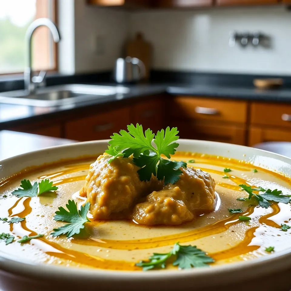કઢી તૈયાર થયા પછી ગેસ બંધ કરો. ઉપરથી ઝીણી સમારેલી કોથમીર છાંટો અને થોડી ઘી滴 (વૈકલ્પિક) ઉમેરો. ગરમાગરમ સર્વ કરો.
