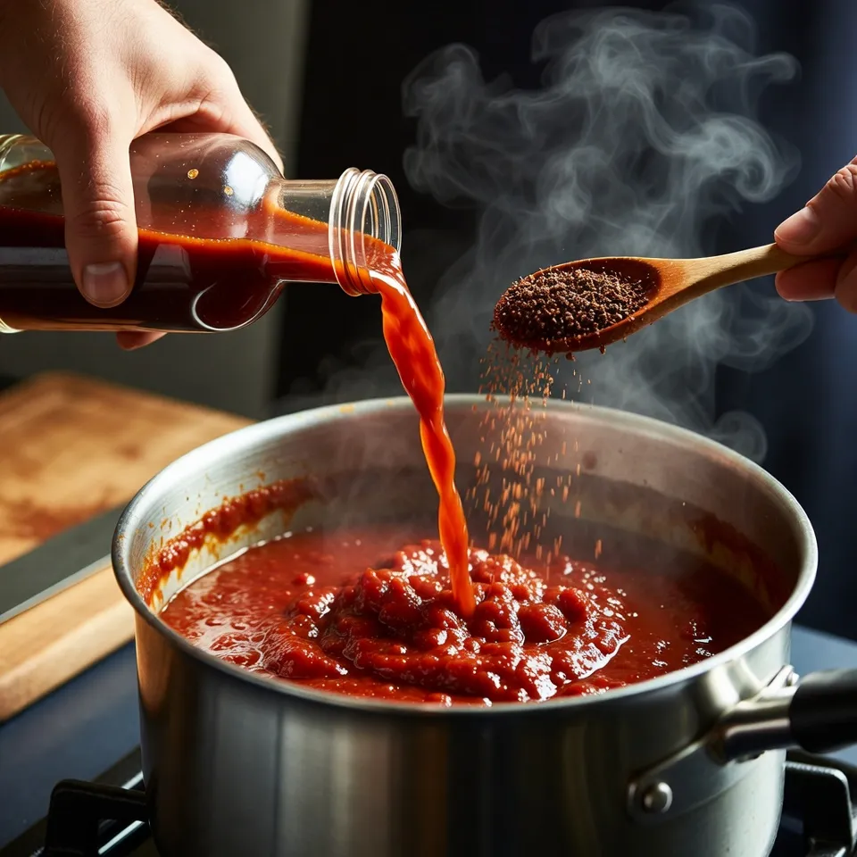 હવે ગાળેલી પ્યુરીને ફરી કડાઈમાં લો. તેમાં તજ, લવિંગ અને તેજપત્તા ઉમેરો. મધ્યમ આંચ પર પ્યુરીને ઉકળવા દો. સતત હલાવતા રહો જેથી પ્યુરી તળિયે ચોંટે નહીં. ધીમે ધીમે પ્યુરી ઘાટી થવા લાગશે અને કેચઅપનો અસલી રંગ આવશે.