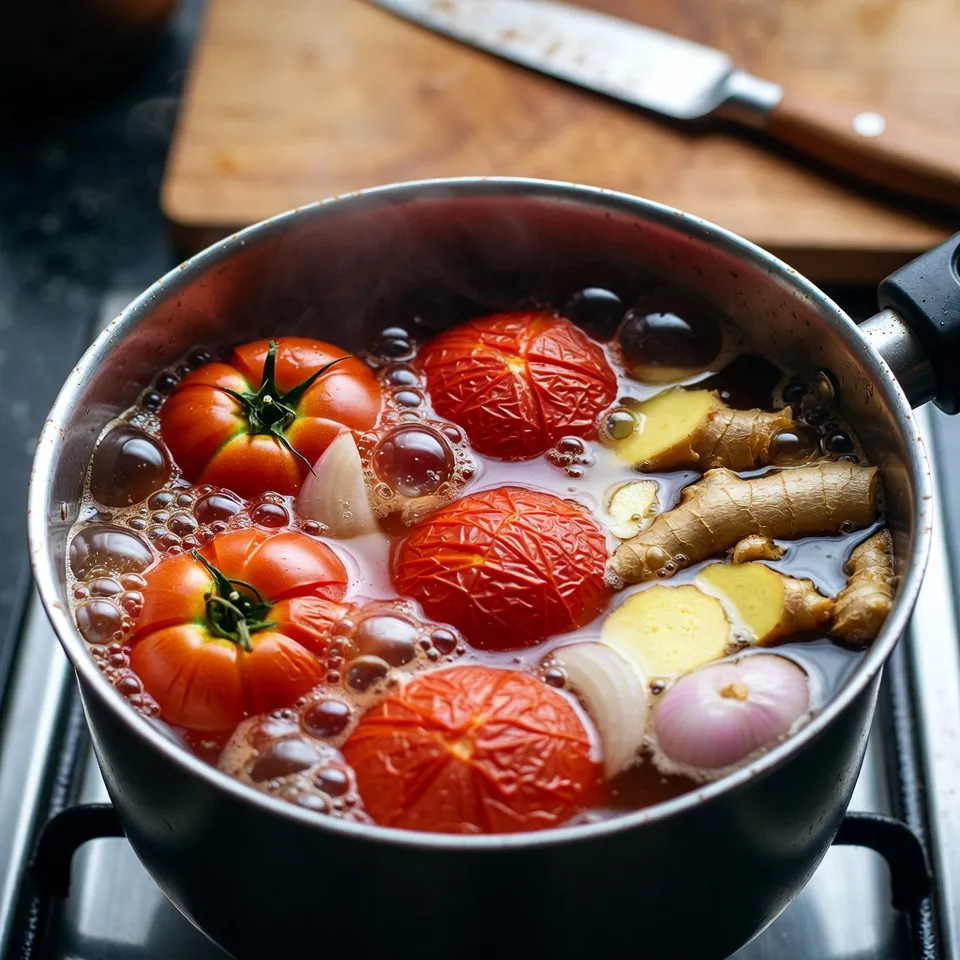 સૌ પ્રથમ ટોમેટાને સારી રીતે ધોઈ લો અને મોટા ટુકડામાં કાપી લો. એક કડાઈમાં ટોમેટા, લસણ, આદુ અને ડુંગળી (જો વાપરતા હો તો) ભેગા કરો. તેમાં થોડું પાણી ઉમેરો અને મધ્યમ આંચ પર 10 થી 12 મિનિટ સુધી ઉકાળો જેથી ટોમેટા એકદમ નરમ થઈ જાય અને છાલ સરળતાથી અલગ થઈ જાય.