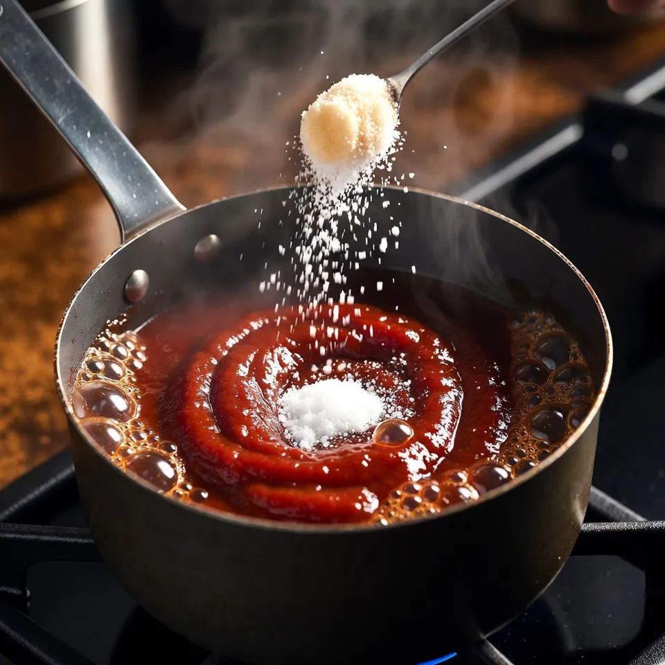 હવે તેમાં ખાંડ અને મીઠું ઉમેરો. ખાંડ ઉમેર્યા પછી કેચઅપ વધુ ચમકદાર લાગે છે અને સ્વાદમાં ખાટાશનું બેલેન્સ સરસ થાય છે. આ સ્ટેજ પર કેચઅપને 15 થી 20 મિનિટ સુધી ધીમી આંચ પર ચડવા દો જેથી તે ગાઢ અને રિચ બને.