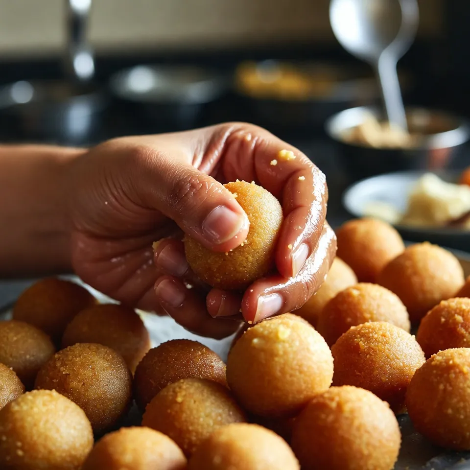 મિશ્રણ થોડું ઠંડું થાય ત્યારે હાથમાં થોડું ઘી લગાવો અને નાના ગોળાકાર લાડુ બનાવો. દરેક લાડુ સમાન આકારમાં હોવું જોઈએ. નરમ લાડુ માટે મિશ્રણ વધારે ઠંડુ ન થવા દો.
