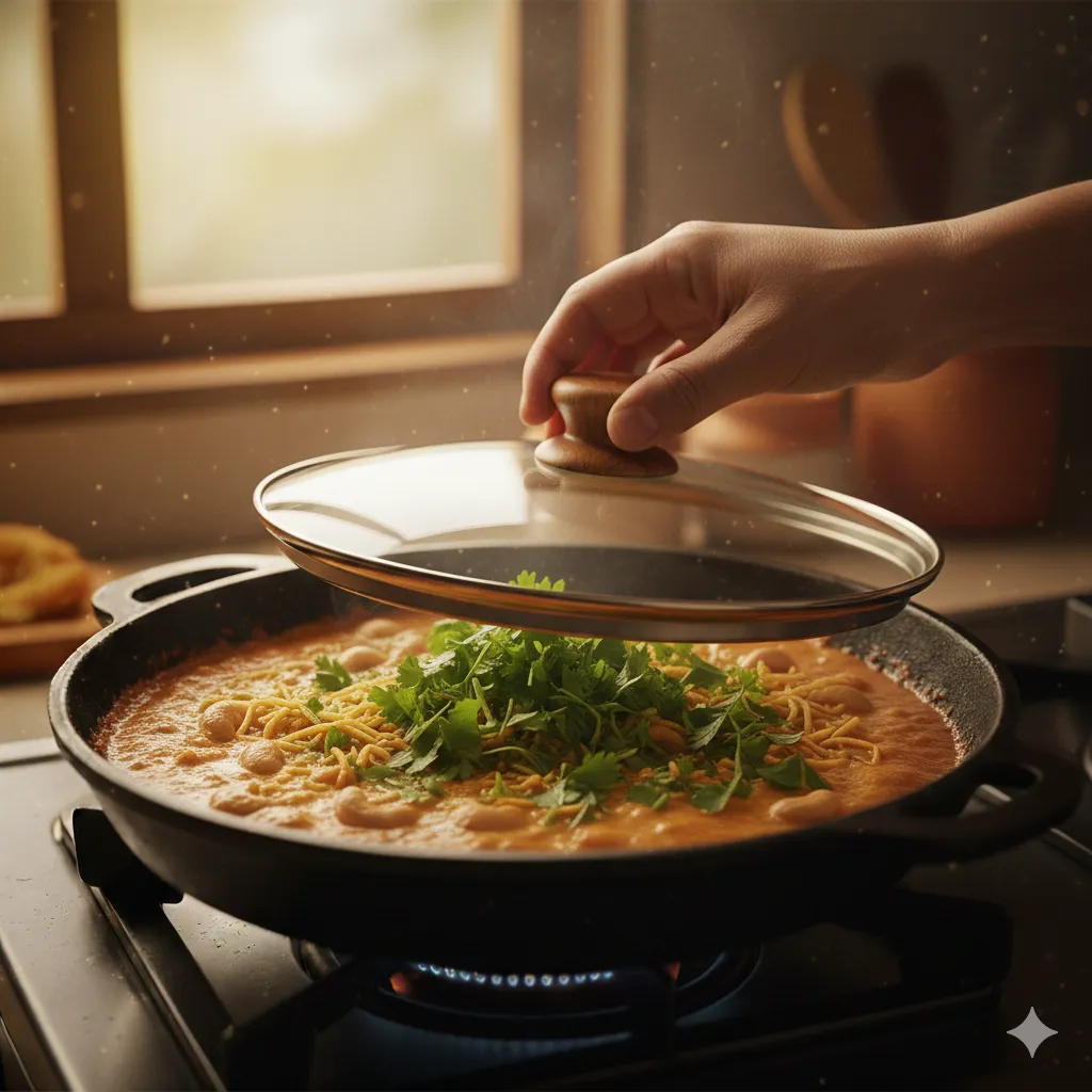 ગેસ બંધ કરવાથી એક મિનિટ પહેલા ગાંઠીયા ઉમેરો અને હળવે હાથે મિક્સ કરો. ગાંઠીયા વધારે સમય ઉકળશે તો ખૂબ નરમ થઈ જશે, એટલે અંતમાં જ ઉમેરવા. બે મિનિટ ઢાંકણ ઢાંકી ને રાખશો તો ગાંઠીયા સરસ રીતે ગ્રેવીમાં સેટ થઈ જશે.