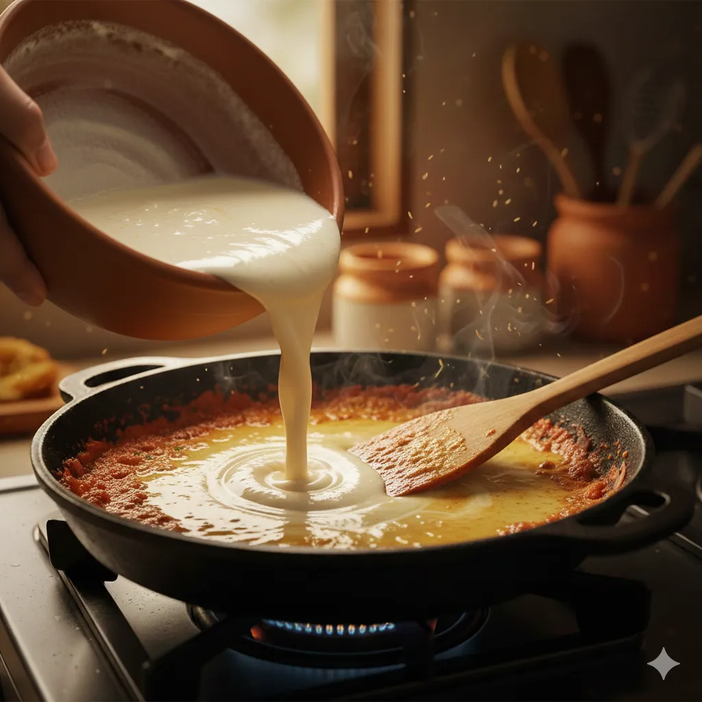 હવે આંચ ધીમી કરો અને તૈયાર કરેલી છાશ ધીમે ધીમે કડાઈમાં ઉમેરો. સતત હલાવતા રહો જેથી છાશ ફાટી ન જાય. છાશ ઉકળવા લાગે પછી પાંચથી સાત મિનિટ ધીમી આંચ પર ચડવા દો જેથી ગ્રેવી સરસ ઘાટી બને.