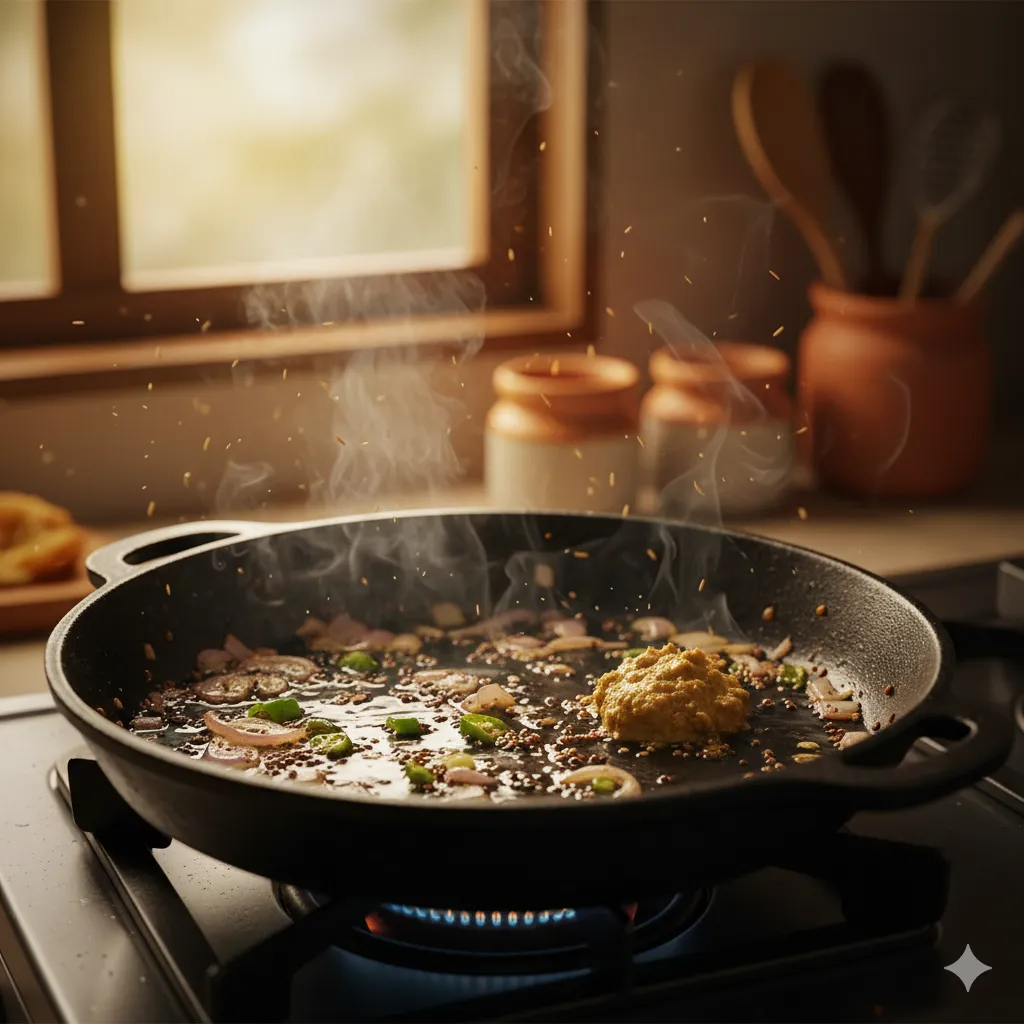 એક કડાઈમાં તેલ ગરમ કરો. તેમાં રાઈ અને જીરું ઉમેરો. રાઈ તડતડાય એટલે હિંગ, સમારેલી ડુંગળી અને લીલી મરચી ઉમેરો. ડુંગળી હળવી ગુલાબી થાય ત્યાં સુધી સાંતળો. ત્યારબાદ આદુ-લસણ પેસ્ટ ઉમેરો અને સુગંધ આવે ત્યાં સુધી શેકો.