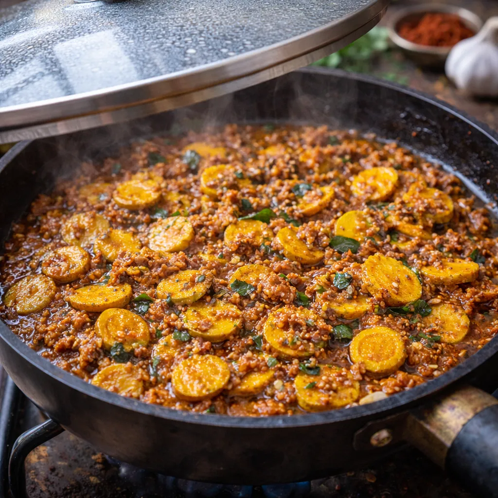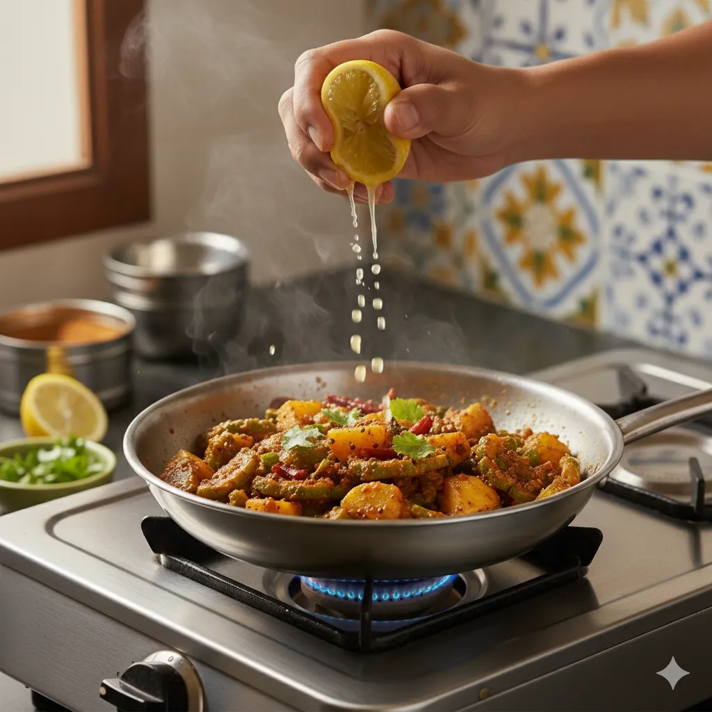 હળદર નરમ થઈ જાય અને શાક સુકું દેખાય ત્યારે સ્વાદ ચેક કરો. જરૂર હોય તો મીઠું એડજસ્ટ કરો. ગેસ બંધ કરીને ઉપરથી ઝીણી સમારેલી કોથમીર છાંટો.