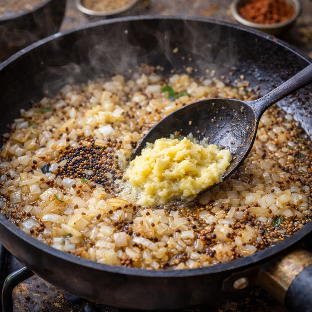 એક કડાઈમાં તેલ ગરમ કરો. તેમાં રાઈ અને જીરું ઉમેરો. રાઈ તડતડાય એટલે હિંગ, સમારેલી ડુંગળી અને લીલી મરચી ઉમેરો. ડુંગળી હળવી ગુલાબી થાય ત્યાં સુધી સાંતળો. ત્યારબાદ આદુ-લસણ પેસ્ટ ઉમેરીને કાચો વાસ ન જાય ત્યાં સુધી શેકો.