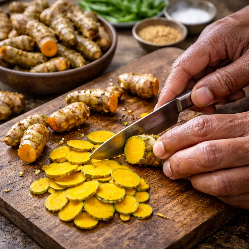 સૌ પ્રથમ લીલી હળદરને સારી રીતે ધોઈ લો અને પાતળી સ્લાઈસમાં કાપો. હાથ પર રંગ ન ચડે તે માટે તેલ લગાવીને કાપશો તો સારું. કાપેલી હળદરને થોડા સમય માટે પાણીમાં રાખો જેથી કડવાશ થોડી ઘટે.