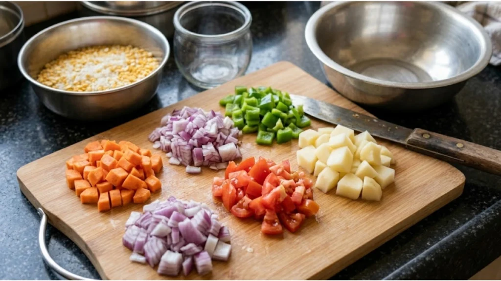 ગાજર, બટાકા, ડુંગળી, ટમેટા અને શિમલા મરચું બધી સામગ્રી સમાન નાના ટુકડામાં કાપો જેથી ખીચડીમાં સરખી રીતે રંધાય. નાના ટુકડા રહેશે તો દરેક ચમચીમાં સરસ ટેક્સચર મળશે અને બાળકોને પણ સરળતાથી ગમશે.