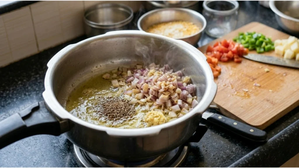 કુકરમાં ઘી ગરમ કરો અને તેમાં જીરું ઉમેરો. જીરું તડકે પછી ડુંગળી ઉમેરો અને હળવી ગોલ્ડન થાય ત્યાં સુધી સાંતળો. હવે લીલા મરચા અને આદુ-લસણ પેસ્ટ ઉમેરો જેથી સુંદર સુગંધ આવે. પછી ટમેટા ઉમેરો અને થોડું નરમ થાય ત્યાં સુધી શેકો.