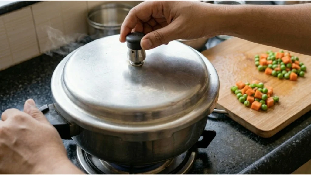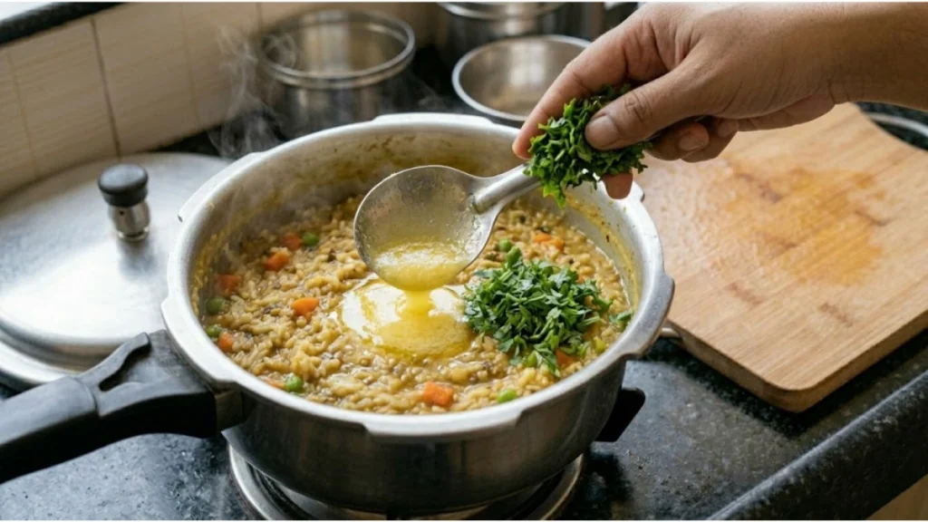 કુકર ઠંડો થાય પછી ઢાંકણ ખોલો અને હળવે હલાવો. ઉપરથી કોથમીર અને થોડું ઘી ઉમેરો જેથી સ્વાદ વધુ સમૃદ્ધ બને. જો જરૂર લાગે તો થોડું ગરમ પાણી ઉમેરીને ટેક્સચર એડજસ્ટ કરી શકાય.