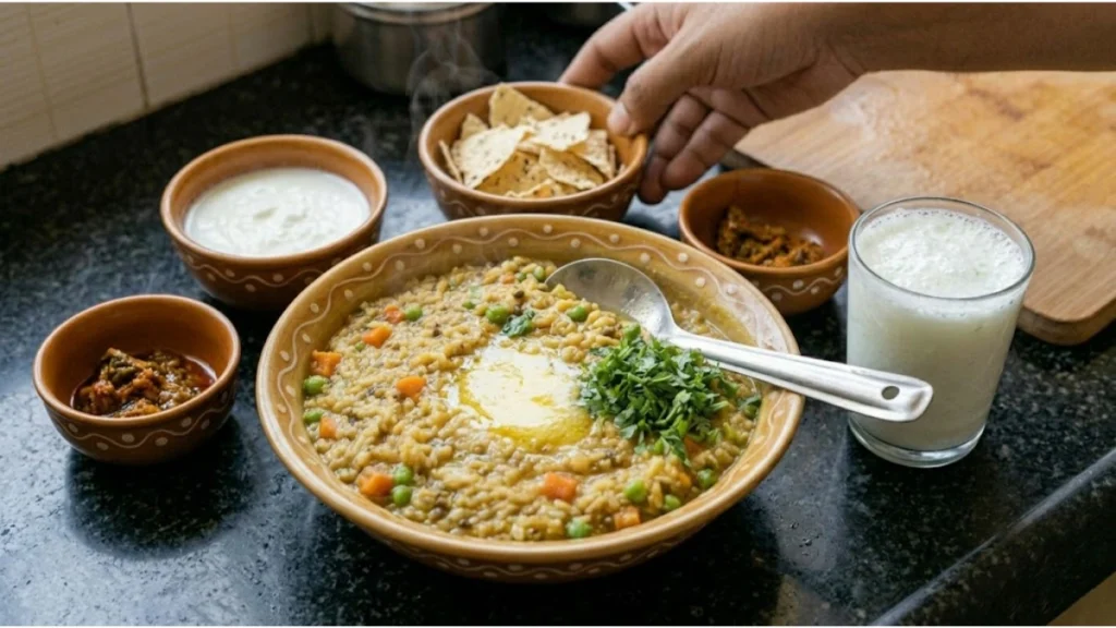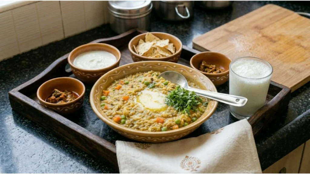 મિક્સ વેજ ખીચડીને ગરમાગરમ દહીં, પાપડ, અથાણું અને છાશ સાથે પીરસશો તો સંપૂર્ણ ગુજરાતી જમણ તૈયાર થઈ જશે. વરસાદી વાતાવરણમાં આ વાનગી વધુ આનંદ આપે છે અને બીમારી પછી પણ શરીર માટે હળવી રહે છે.