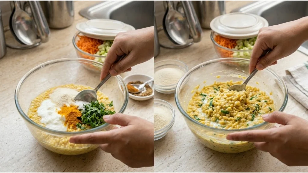 હવે પીસેલા બેટરમાં દહીં, રવો, મીઠું, હળદર અને સમારેલી કોથમીર ઉમેરો. બધું સારી રીતે મિક્સ કરો જેથી દરેક સામગ્રી સરખી રીતે ભળી જાય. બેટરને પંદરથી વીસ મિનિટ ઢાંકીને રાખો જેથી રવો થોડો ફૂલી જાય અને બેટર વધુ સ્થિર બને.