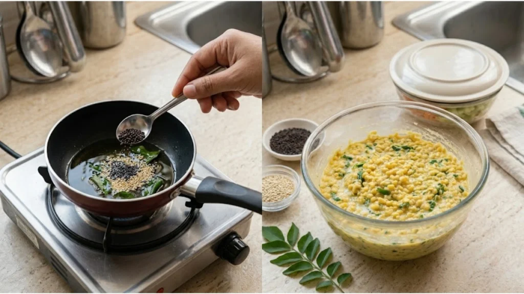એક જાડી કડાઈ અથવા નોનસ્ટિક પેનમાં થોડું તેલ ગરમ કરો. તેમાં રાઈ, તલ અને કરી પત્તા ઉમેરો. રાઈ તડકવા લાગે એટલે આ તડકો બેટરના નીચેના ભાગ માટે સરસ ક્રિસ્પી લેયર બનાવશે.