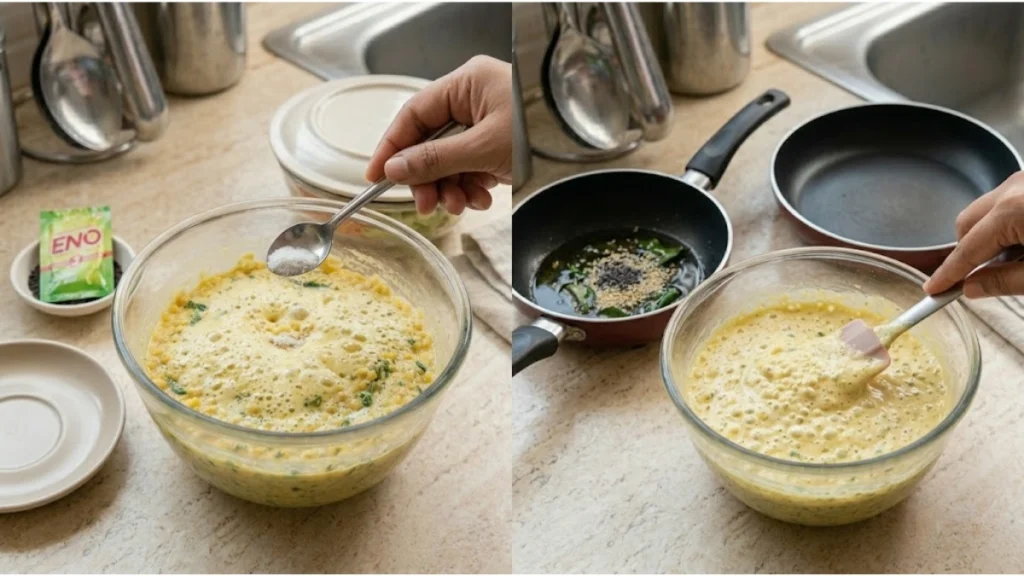 બેટર તૈયાર થયા પછી તેમાં ઇનો ઉમેરો અને હળવે હલાવો. ઇનો ઉમેર્યા પછી તરત જ બેટર પેનમાં નાખવું જોઈએ જેથી હેન્ડવો સોફ્ટ બને. હવે બેટરને પેનમાં સરખું ફેલાવો.