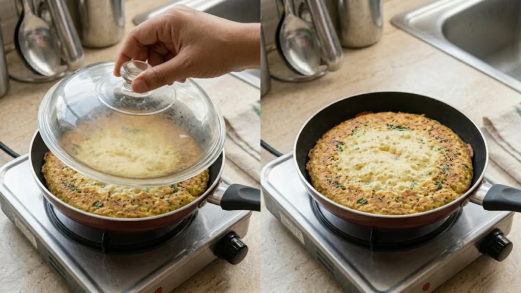 પેનને ઢાંકણથી ઢાંકી ધીમી આંચ પર દસથી બાર મિનિટ સુધી શેકો. વચ્ચે ચેક કરતા રહો કે નીચેનો ભાગ ગોલ્ડન થાય છે કે નહીં. પછી ધીમેથી પલટાવો અને બીજી બાજુ પણ શેકો. આ સ્ટેપમાં ધીરજ રાખશો તો બહારની લેયર એકદમ કરકરી બને છે.