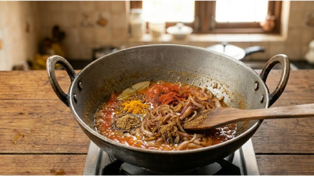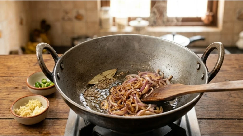 એક કડાઈમાં તેલ ગરમ કરો અને તેમાં જીરું તથા તેજપાન ઉમેરો. હવે ડુંગળી ઉમેરો અને ગોલ્ડન થાય ત્યાં સુધી ધીમે સાંતળો. ડુંગળી યોગ્ય રીતે શેકાશે તો ગ્રેવીનો સ્વાદ વધુ ઊંડો બને છે. હવે આદુ-લસણ પેસ્ટ અને લીલા મરચા ઉમેરો અને સુગંધ આવે ત્યાં સુધી શેકો.