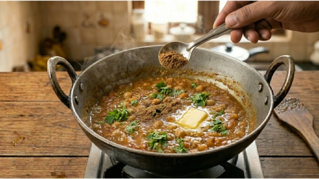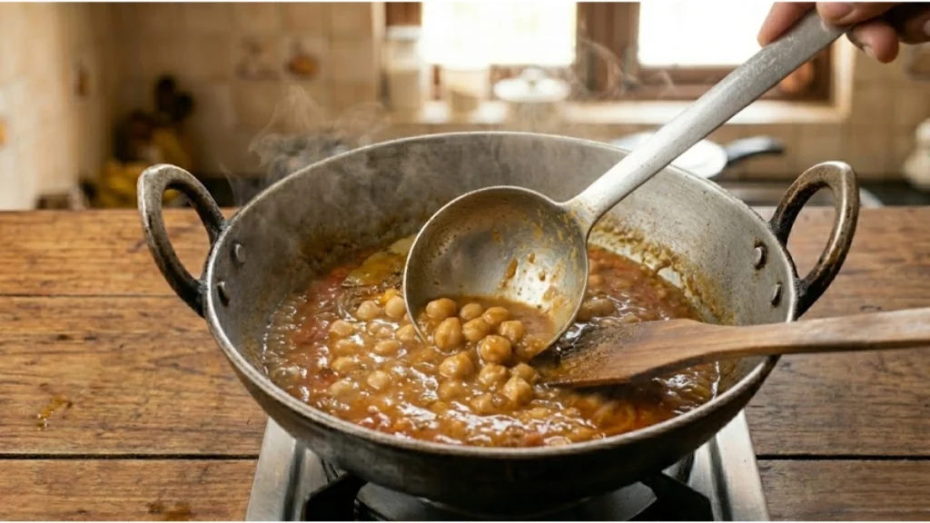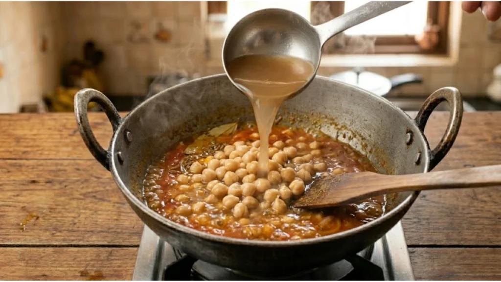 થોડા ચણાને ચમચીથી હળવાં મસળી દો જેથી ગ્રેવી વધુ ઘાટી બને. આ સ્ટેપથી રેસ્ટોરન્ટ જેવી ટેક્સચર મળે છે અને સ્વાદ વધુ સમૃદ્ધ લાગે છે.