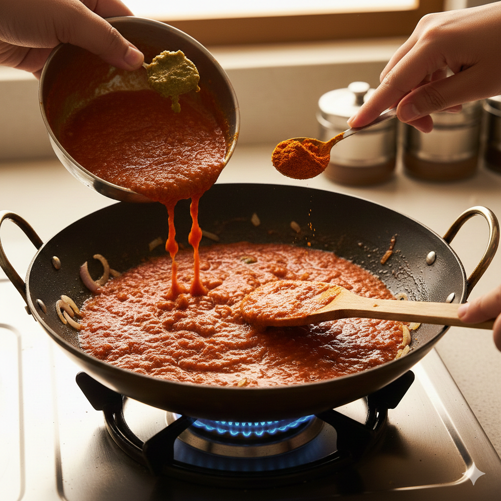લોટ શેકાઈ જાય એટલે તેમાં આદુ-લસણની પેસ્ટ અને ટામેટાની પ્યુરી ઉમેરો. ત્યારબાદ બધા પાવડર મસાલા ઉમેરી તેને તેલ છૂટું પડે ત્યાં સુધી ધીમા તાપે ચઢવા દો.