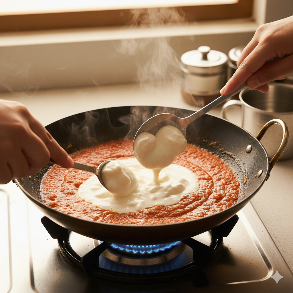 જ્યારે ગ્રેવી તેલ છોડવા માંડે, ત્યારે ગેસ ધીમો કરી ૨ ચમચી ફેંટેલું દહીં ઉમેરો અને સતત હલાવો. દહીં ગ્રેવીને એક રિચ ટેક્સચર આપશે. હવે તેમાં જરૂર મુજબ ગરમ પાણી ઉમેરો.