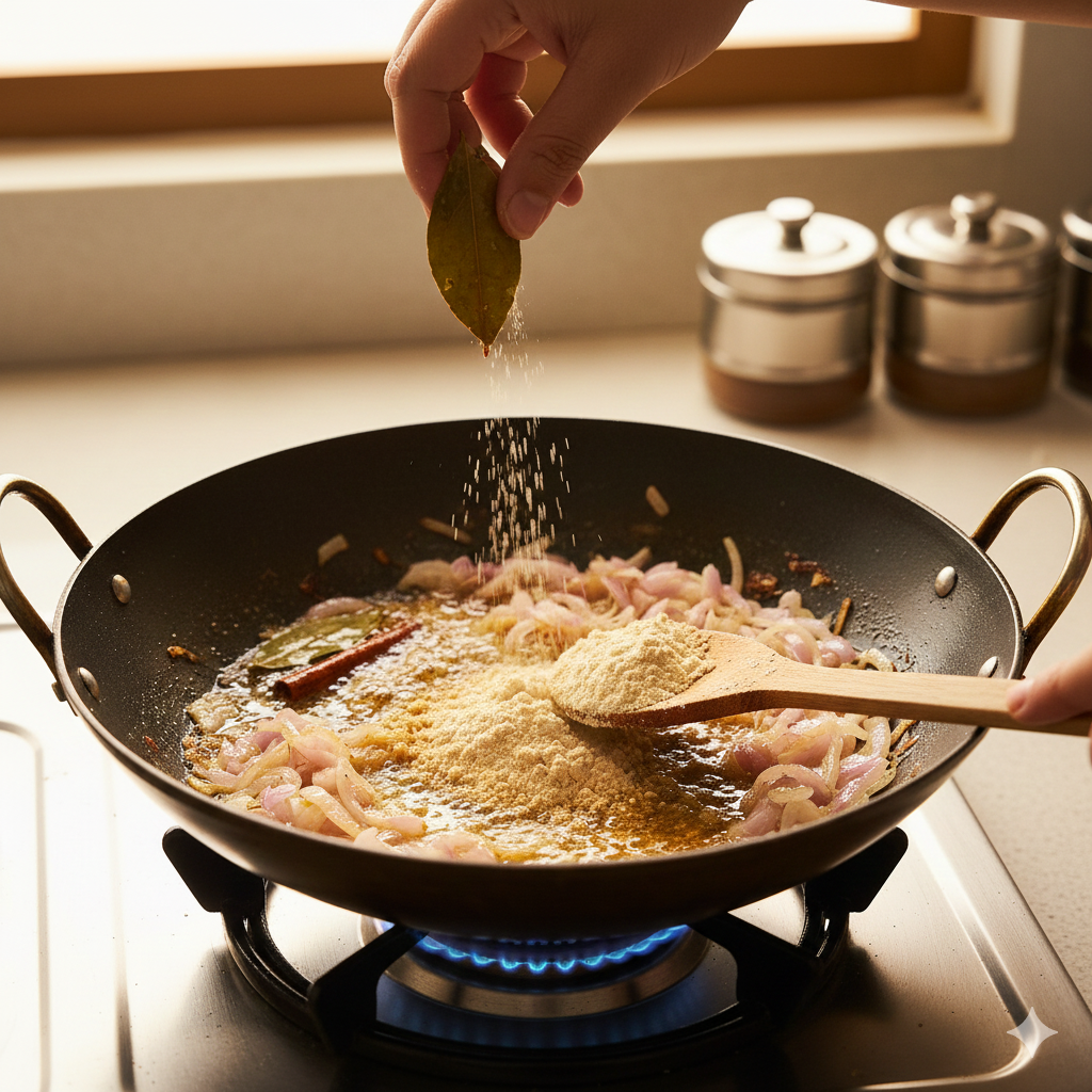 એક કઢાઈમાં તેલ અને ઘી ગરમ કરો. તેમાં આખા મસાલા (તમાલપત્ર, તજ વગેરે) નાખો. હવે તેમાં ઝીણી સમારેલી ડુંગળી ઉમેરી ગુલાબી થાય ત્યાં સુધી સાંતળો. હવે તેમાં ૧ ચમચી ચણાનો લોટ ઉમેરો. લોટ શેકાશે એટલે ગ્રેવીને હોટલ જેવી ઘટ્ટ બનાવશે.