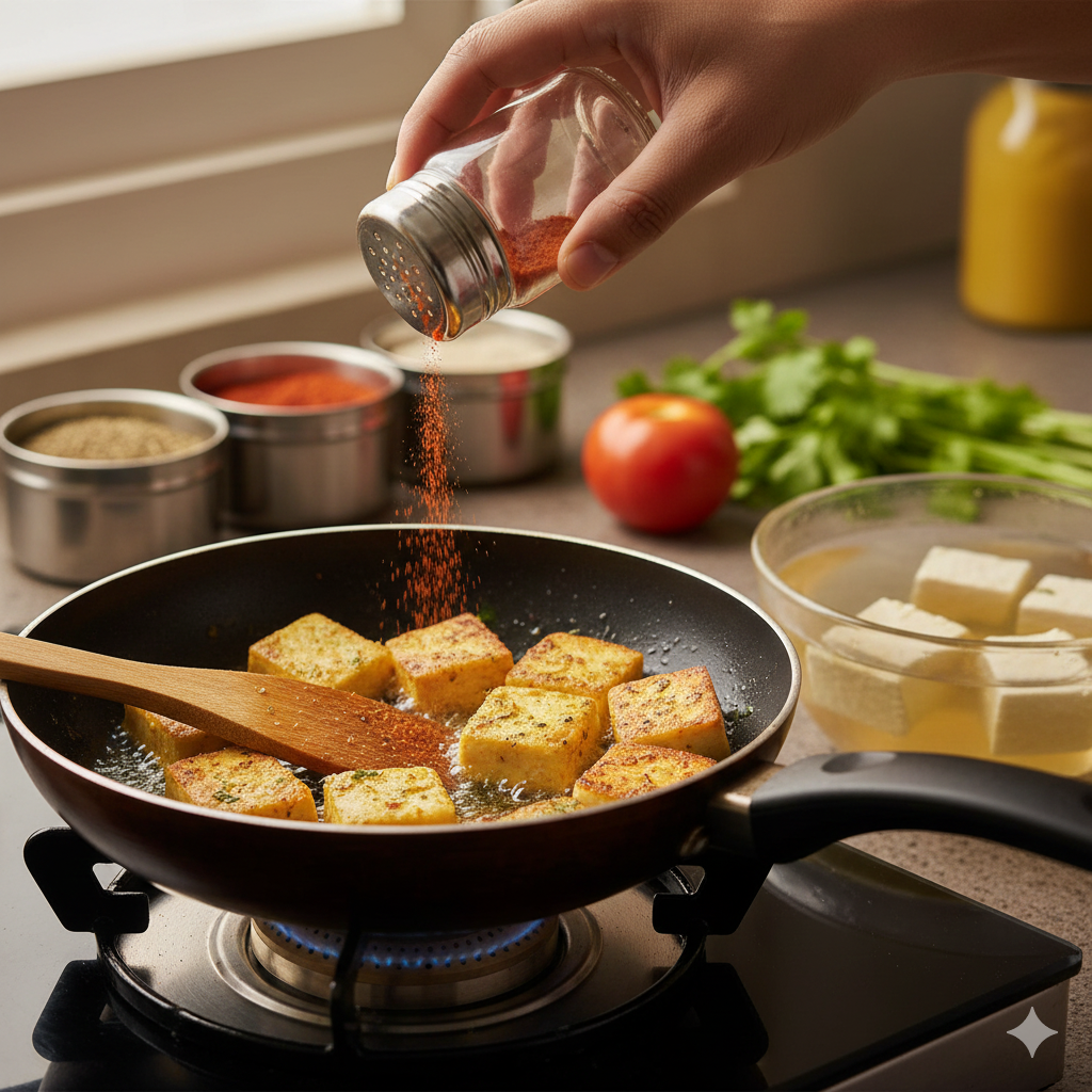 સૌ પ્રથમ એક પેનમાં થોડું તેલ કે ઘી લો. તેમાં પનીરના ટુકડા નાખી, ઉપરથી ચપટી હળદર અને લાલ મરચું ભભરાવી હલકું સાંતળી લો. ટ્રિક: સાંતળેલા પનીરને તરત જ સહેજ ગરમ મીઠાવાળા પાણીમાં નાખી દો. આનાથી પનીર રબર જેવું કડક નહીં થાય અને છેલ્લે સુધી સોફ્ટ રહેશે.