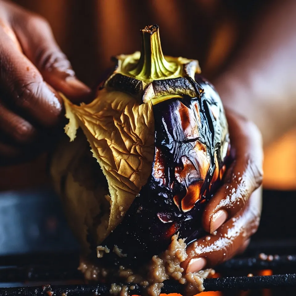 રીંગણ ઠંડું થાય પછી તેની છાલ કાઢી લો. ડાંડી દૂર કરો અને રીંગણને હાથથી અથવા ચમચીથી સરસ મસળી લો. આ સ્ટેજ પર રીંગણમાં ધુમાડાવાળો સ્વાદ સૌથી વધુ રહે છે.