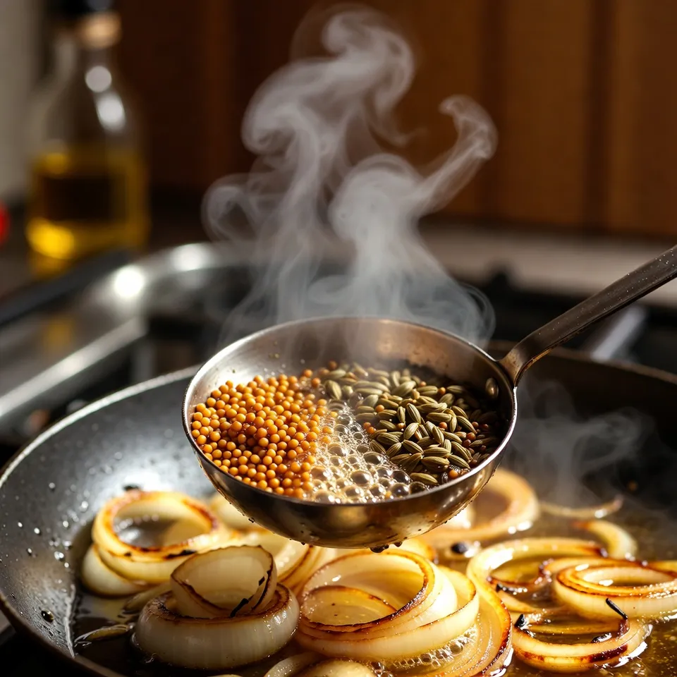 એક કડાઈમાં તેલ ગરમ કરો. તેમાં રાઈ અને જીરું ઉમેરો. રાઈ તડતડાય એટલે હિંગ ઉમેરો. હવે સમારેલી ડુંગળી ઉમેરો અને હળવી નરમ થાય ત્યાં સુધી સાંતળો. જો ટામેટું ઉમેરવું હોય તો આ સ્ટેજ પર ઉમેરો અને નરમ થાય ત્યાં સુધી શેકો.