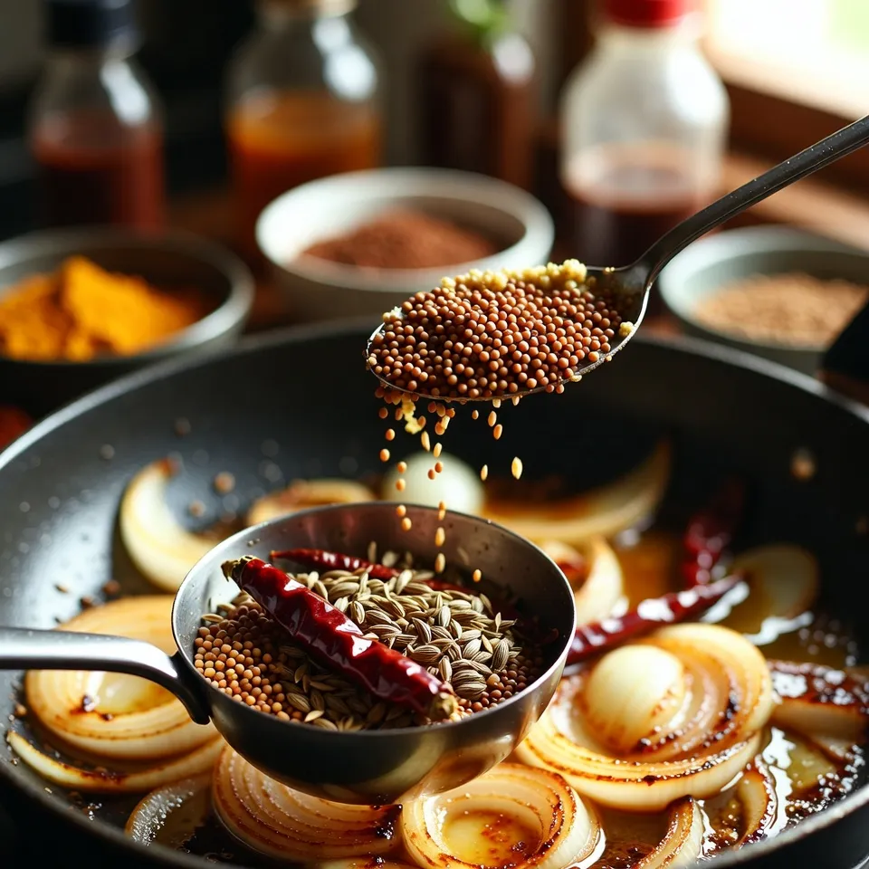 એક કડાઈમાં તેલ ગરમ કરો. તેમાં રાઈ અને જીરું ઉમેરો. રાઈ તડતડાય એટલે હિંગ, સમારેલી ડુંગળી અને લીલી મરચી ઉમેરો. ડુંગળી હળવી ગુલાબી થાય ત્યાં સુધી સાંતળો. ત્યારબાદ આદુ-લસણ પેસ્ટ ઉમેરો અને કાચો વાસ ન જાય ત્યાં સુધી શેકો.
