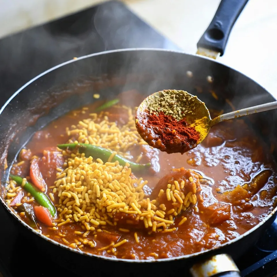 ગ્રેવી તૈયાર થઈ જાય પછી ગેસ ધીમી કરો અને હવે તેમાં સેવ ઉમેરો. સેવ ઉમેર્યા પછી હળવે હાથે મિક્સ કરો અને ૧ થી ૨ મિનિટ જ રાખો. સેવ વધારે સમય ઉકાળશો તો બહુ નરમ થઈ જશે, એટલે સેવ છેલ્લે જ ઉમેરવી એ સૌથી મહત્વની ટિપ છે.