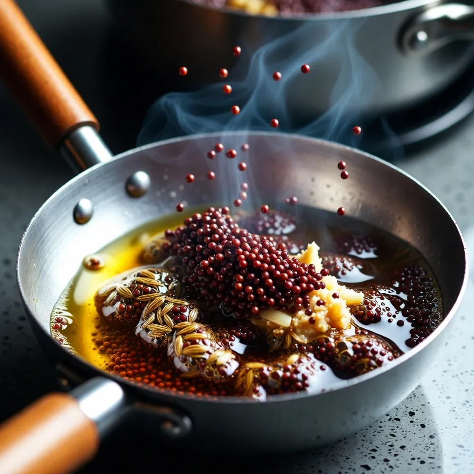 એક કડાઈમાં તેલ ગરમ કરો. તેમાં રાઈ અને જીરું ઉમેરો. રાઈ તડતડાય એટલે હિંગ ઉમેરો અને પછી લીલા મરચા તથા આદુ-લસણ પેસ્ટ નાખો. એક મિનિટ સુધી સાંતળો જેથી લસણનો કાચો વાસ દૂર થાય અને સુગંધ સરસ રીતે બહાર આવે.