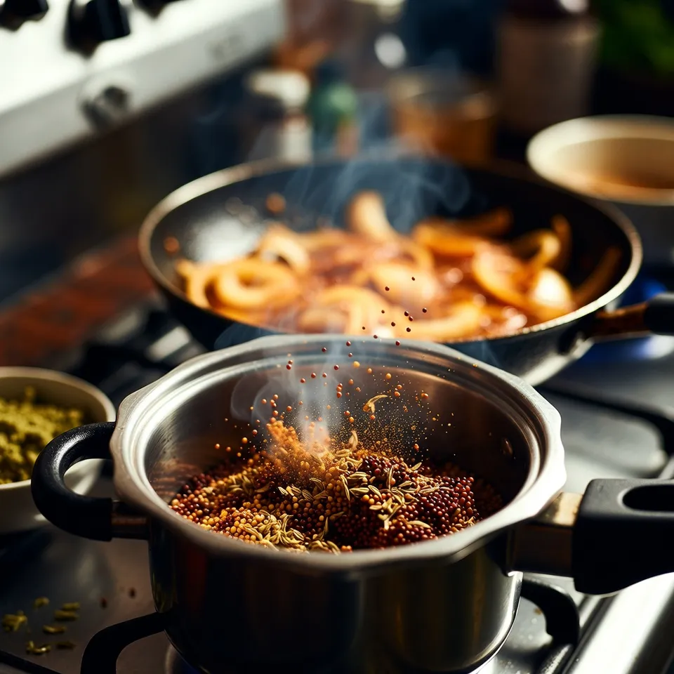 કુકરમાં તેલ ગરમ કરો. તેમાં રાઈ અને જીરું ઉમેરો. રાઈ તડતડાય એટલે હિંગ, સમારેલી ડુંગળી અને લીલી મરચી ઉમેરો. ડુંગળી હળવી ગુલાબી થાય ત્યાં સુધી સાંતળો. ત્યારબાદ આદુ-લસણ પેસ્ટ ઉમેરો અને કાચો વાસ ન જાય ત્યાં સુધી શેકો.