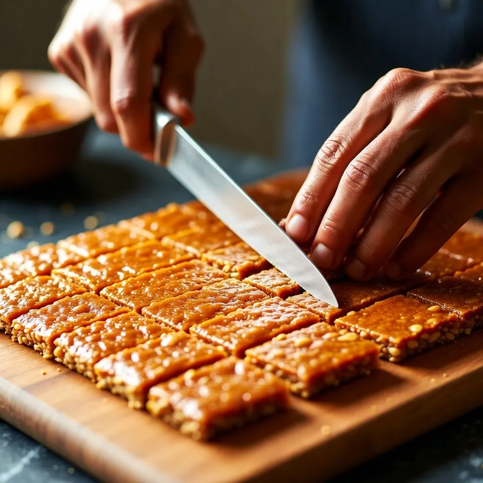 ચીક્કી થોડું ગરમ રહે ત્યારે જ ચાકૂથી ચોરસ કે ડાયમંડ આકારમાં કાપી લો. સંપૂર્ણ ઠંડી થયા પછી ચીક્કી એકદમ કઠણ અને કરકરું બની જશે.