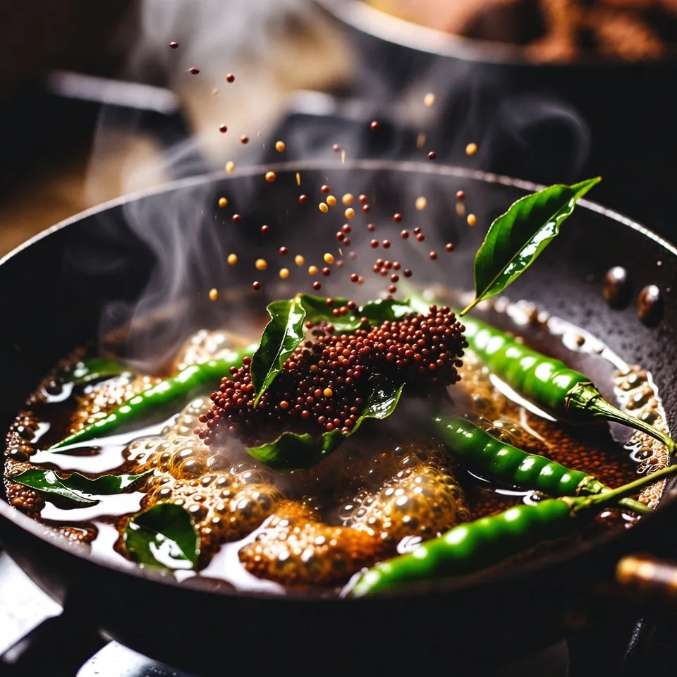 એક નાની કડાઈમાં તેલ ગરમ કરો. તેમાં રાઈ ઉમેરો. રાઈ તડતડાય એટલે લીલા મરચા, કરી પત્તા અને હિંગ ઉમેરો. આ વઘાર તરત જ તૈયાર ઇદડા પર રેડો જેથી સુગંધ અંદર સુધી ઉતરી જાય.