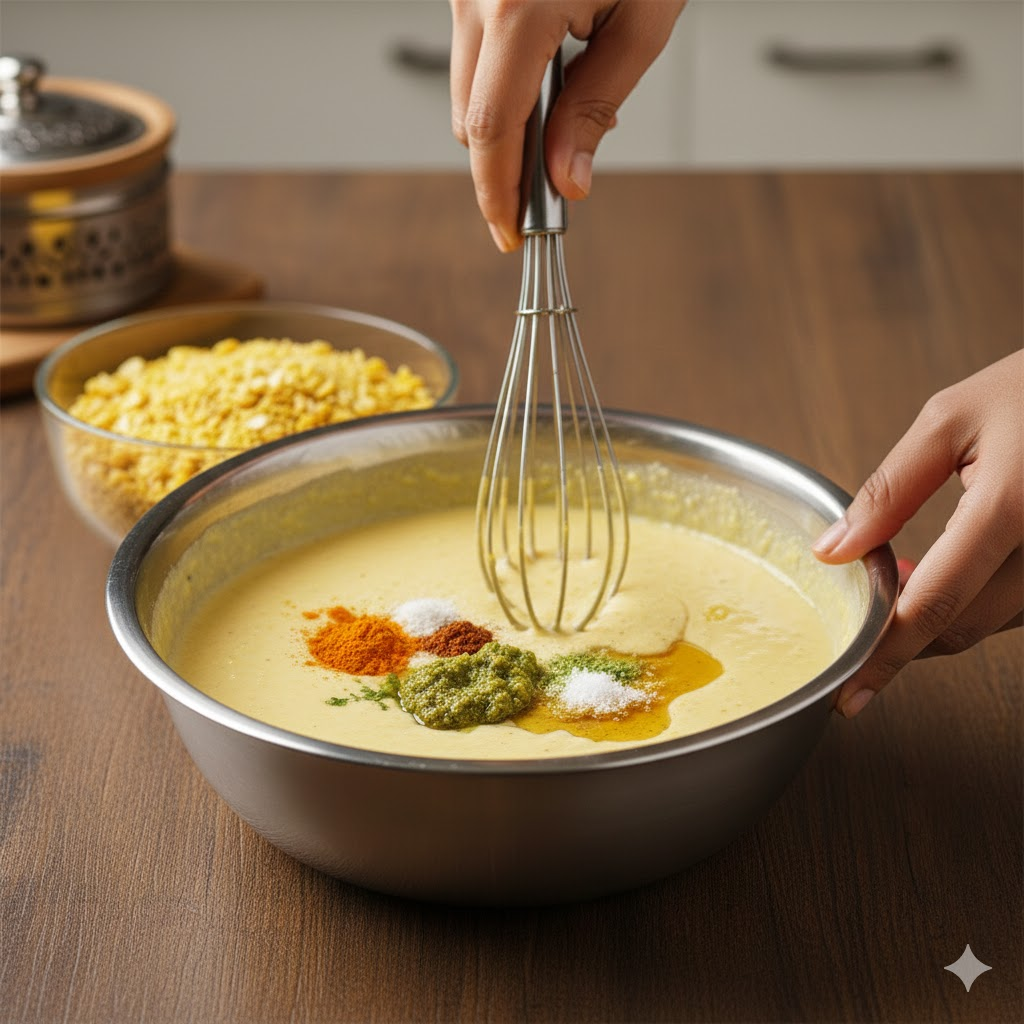 તૈયાર થયેલા ખીરાને એક મોટા વાસણમાં કાઢી લો. હવે તેમાં હળદર, હિંગ, આદુ-મરચાની પેસ્ટ, તેલ અને સ્વાદ મુજબ મીઠું ઉમેરો. આ ખીરાને 2-3 મિનિટ સુધી એક જ દિશામાં બરાબર ફેંટી લો. લોચો બનાવવા માટે ખીરું ઢોકળાના ખીરા કરતા થોડું પાતળું હોવું જોઈએ.
