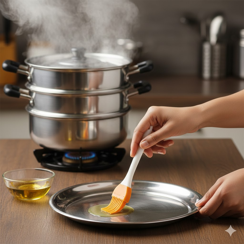 સ્ટીમરમાં પાણી ગરમ કરવા મૂકો. લોચો બનાવવા માટેની થાળીને તેલથી ગ્રીસ કરી લો.