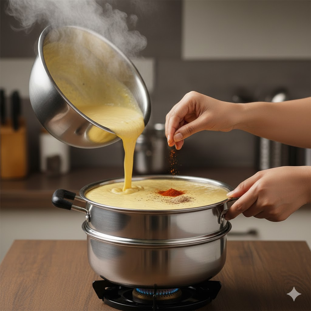 ખીરામાં ઈનો ઉમેરીને તેના પર થોડું પાણી નાખો અને હળવા હાથે મિક્સ કરો. હવે આ ખીરાને ગ્રીસ કરેલી થાળીમાં પાતળું ફેલાવો. ઉપરથી થોડું લાલ મરચું અને મરી પાવડર છાંટો. તેને મીડિયમ આંચ પર 10 થી 12 મિનિટ માટે સ્ટીમ થવા દો.