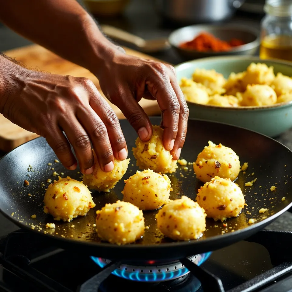 એક નોનસ્ટિક પેન અથવા તવા ગરમ કરો. તેલ/ઘી લગાવો. તૈયાર બટાકા મિશ્રણમાંથી નાના ગોળા બનાવી તવા પર હલકું રોસ્ટ કરો અથવા ફ્રાય કરો.