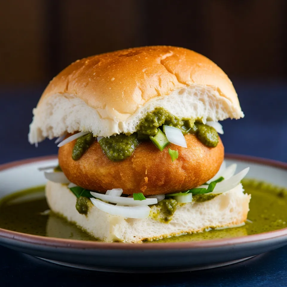 પાવના મધ્યમાં તૈયાર વડા ભરો. ઉપરથી સેવ, ઝીણી સમારેલી કોથમીર અને ઇચ્છા મુજબ લીલી ચટણી લગાવો. પાવને ગોળ રીતે દબાવીને સર્વ કરો.