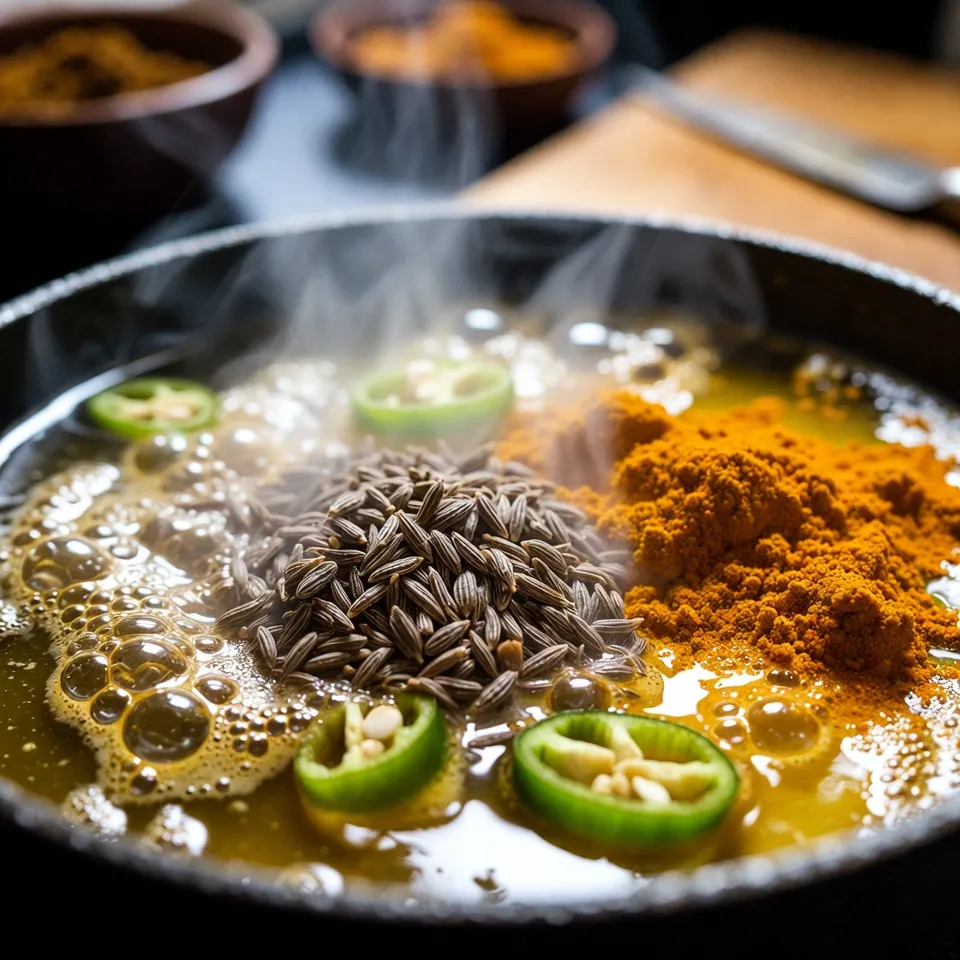 નાની કડાઈમાં ૧–૨ ચમચી ઘી/તેલ ગરમ કરો. તેમાં જીરું, હળદર અને લીલો મરચો ઉમેરી ૧ મિનિટ માટે હલકું શેકો.