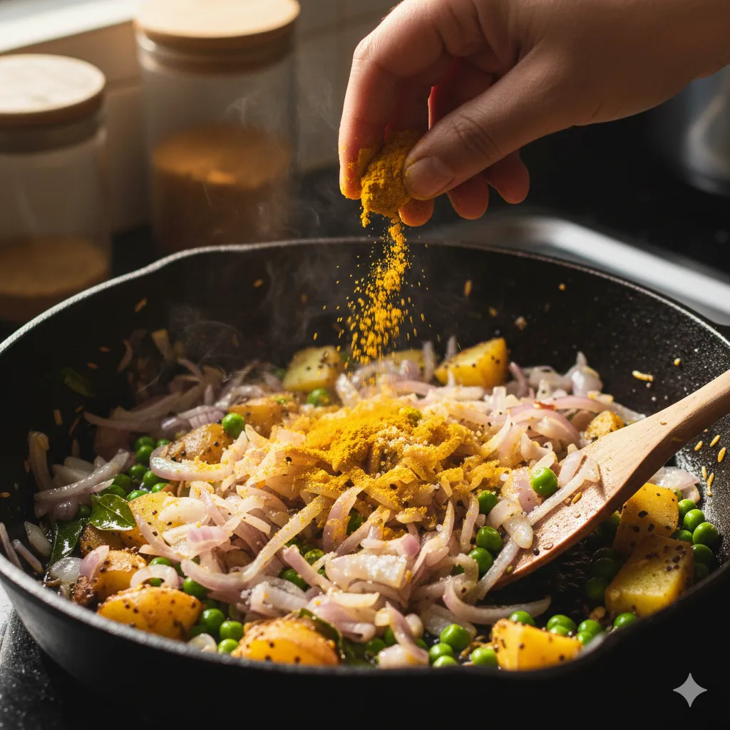 ડુંગળી સરસ સાંતળી જાય પછી તેમાં હળદર અને મીઠું ઉમેરો. મસાલો હળવે હાથે મિક્સ કરો જેથી હળદરનો રંગ સરખો ભળી જાય. આ સ્ટેજ પર પૌંઆમાં સુંદર પીળો રંગ આવે છે.